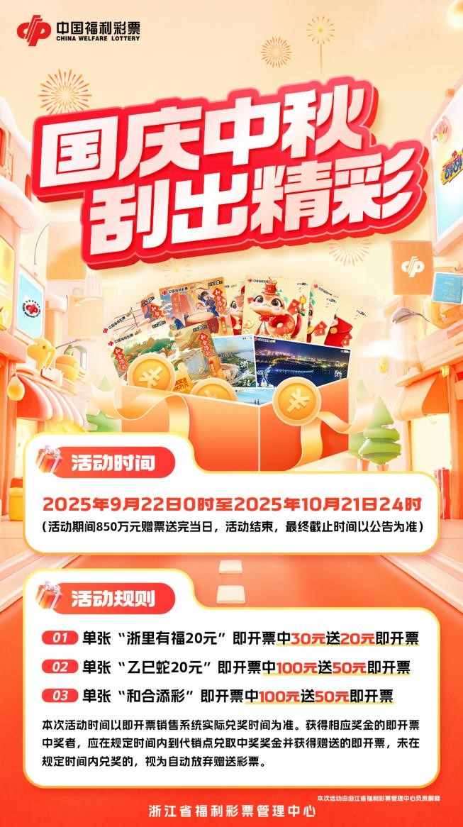 此次活动,将于9月22日0时开始至10月21日24时结束,活动期间,凡购彩者购买20元面值“浙里有福”刮刮乐并在单张彩票中中得30元,兑奖时除获得30元现金奖金,还可额外获得20元刮刮乐赠票;购买20元面值“乙巳蛇”或任意一款“和合添彩”刮刮乐,并在单张彩票中中得100元,兑奖时除获得100元现金奖金,均还可额外获得50元刮刮乐赠票。活动期间850万元赠票送完当日,活动结束。