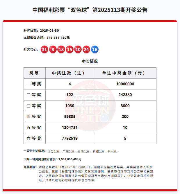 双色球第2025113期:中出一等奖4注,筹集公益金1.35亿元