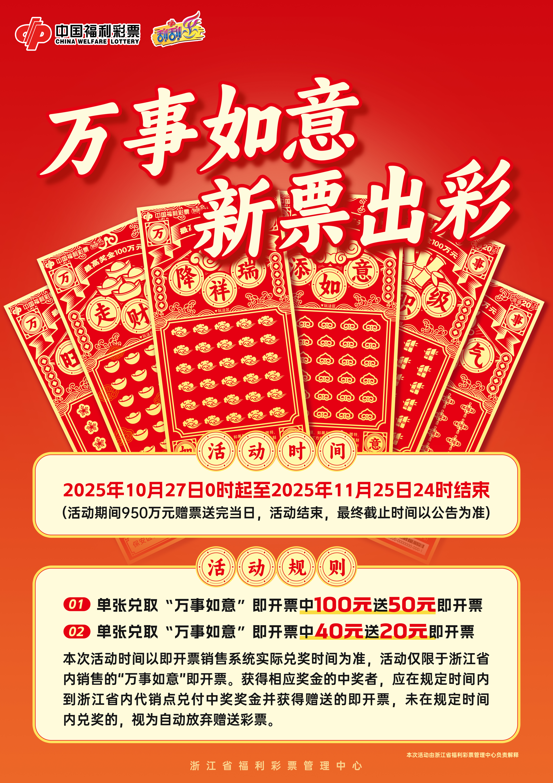 此次活动,于10月27日0时开始至11月25日24时结束,活动期间,凡购彩者购买“万事如意”刮刮乐并在单张彩票中中得100元,兑奖时除获得100元现金奖金,还可额外获得50元刮刮乐赠票;单张彩票中得40元,兑奖时除获得40元现金奖金,还可额外获得20元刮刮乐赠票。活动期间950万元赠票送完当日,活动结束。