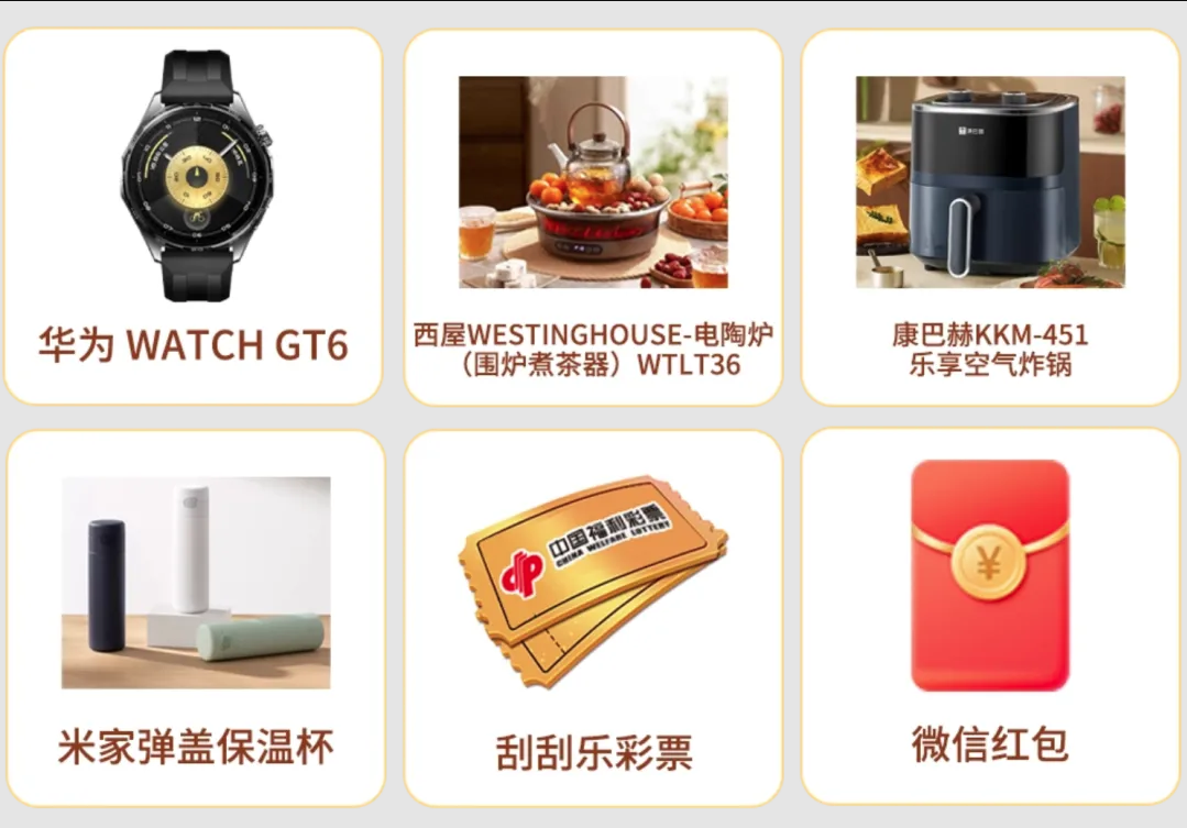 华为 watch GT6、西屋电陶炉、康巴赫空气炸锅、米家保温杯、刮刮乐彩票、微信红包已就位,真的拿到手软!