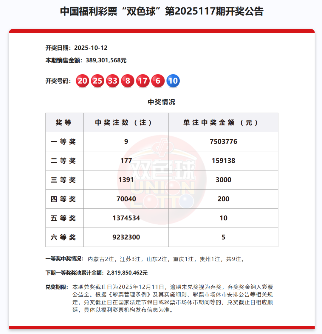 双色球第2025117期:中出一等奖9注,筹集公益金1.40亿元;我省中出二等奖26注