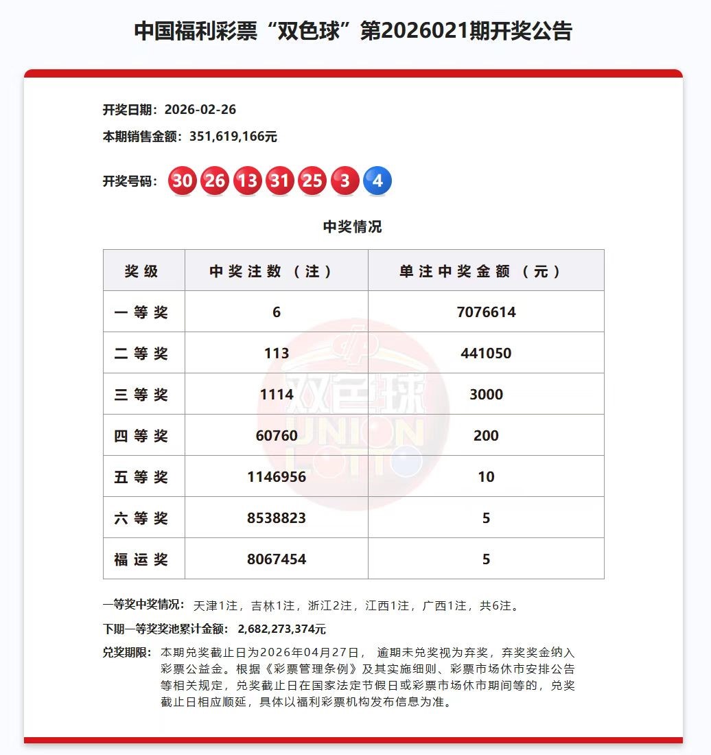 双色球第2026021期销售3.51亿元,