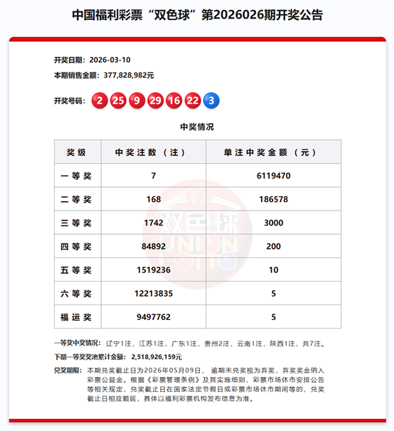 福彩双色球 幸运直通车|双色球第2026026期开奖:中出一等奖7注,下期奖池25.18亿元