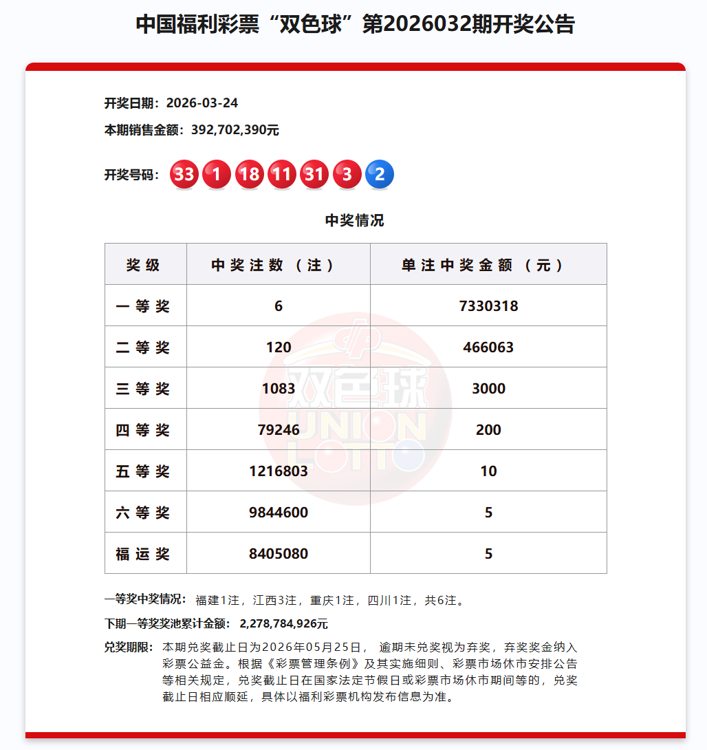 双色球第2026032期: 中出“福运奖”840多万注,下期奖池22.78亿元