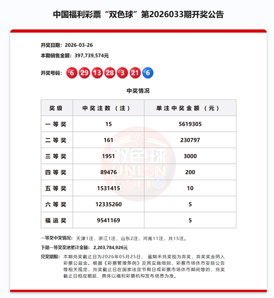 双色球第2026033期开奖: 中出一等奖15注,单注奖金561多万元