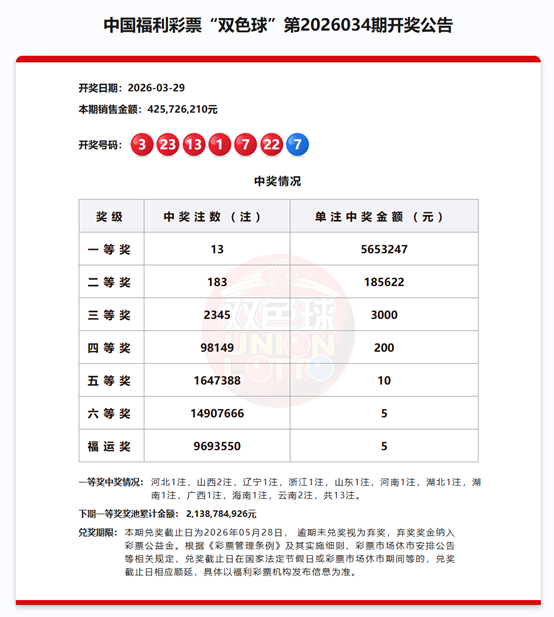 双色球第2026034期开奖: 中出一等奖13注,下期奖池21.38亿元