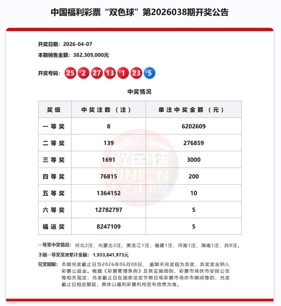 双色球第2026038期开奖:8注一等奖!善意不停,幸运不止