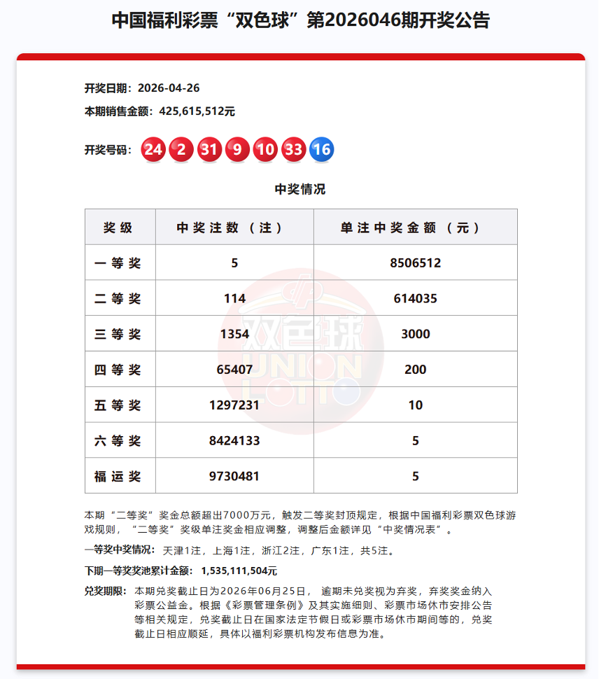双色球第2026046期销售4.25亿元,